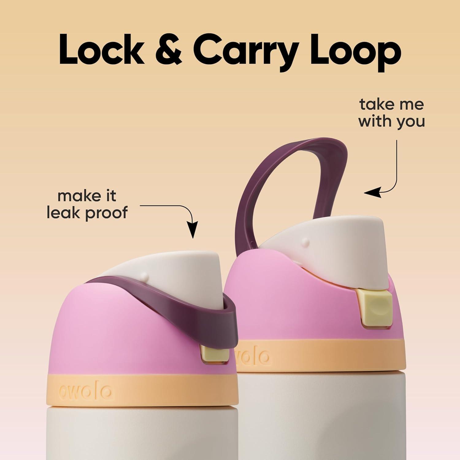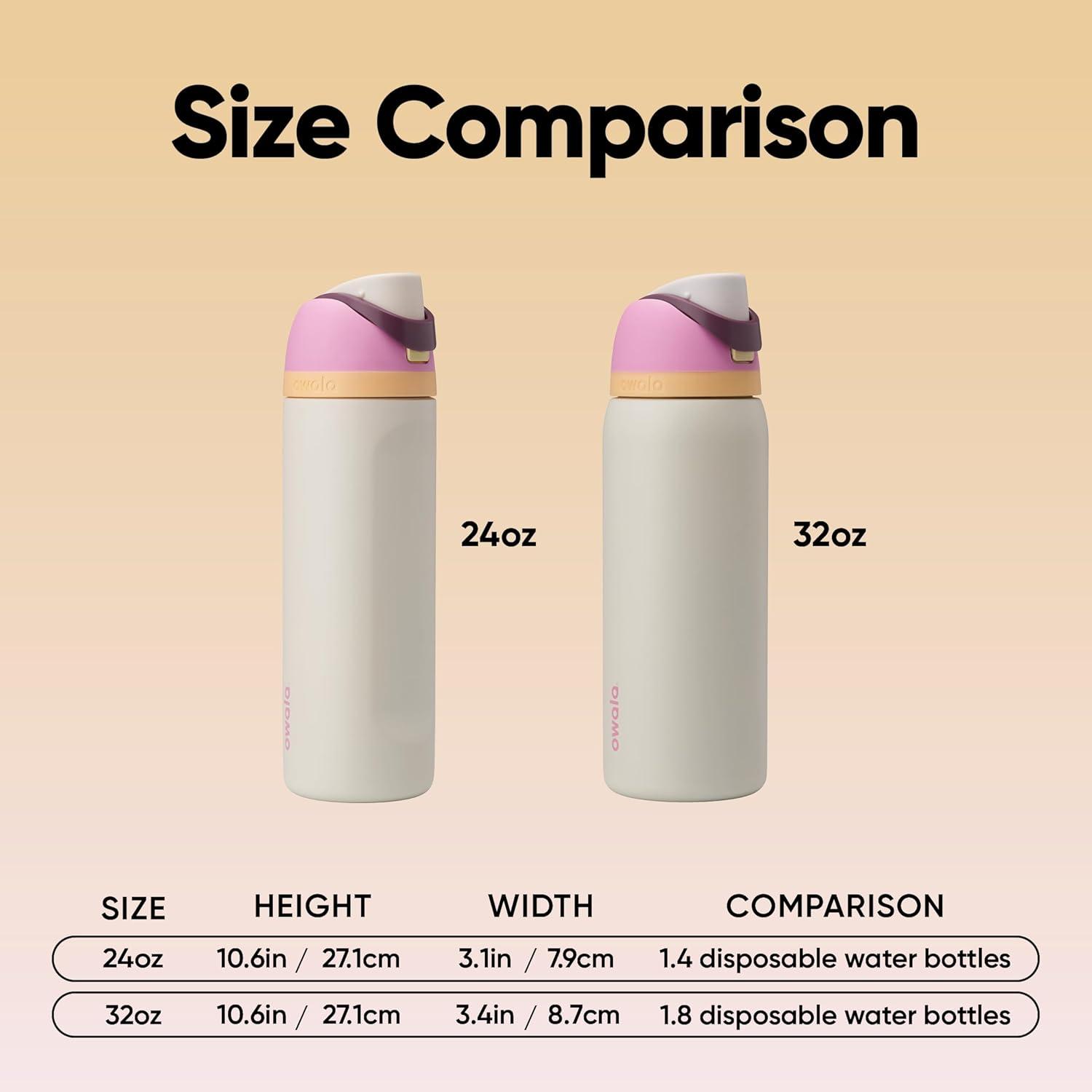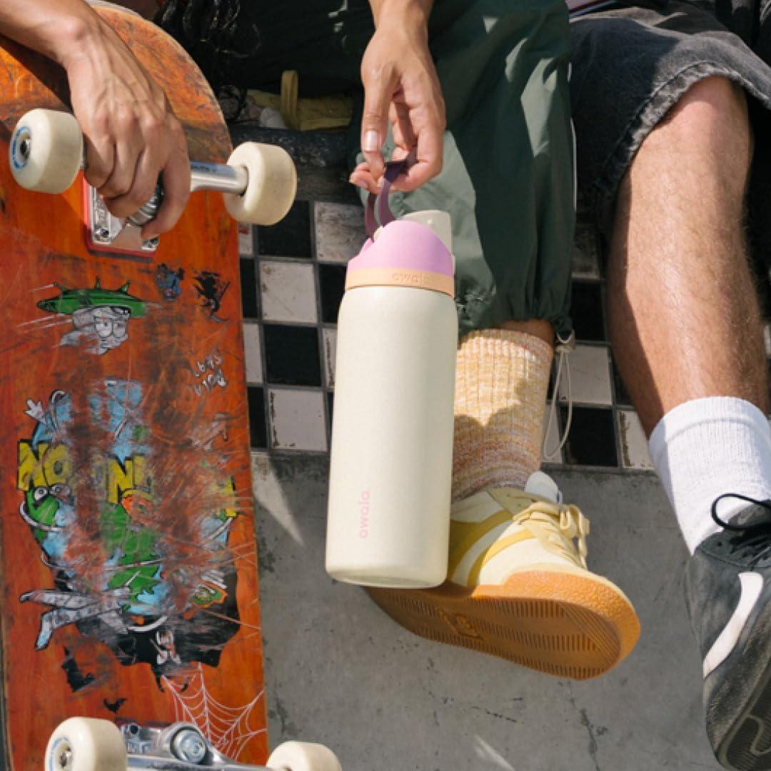 The Owala FreeSip Insulated Stainless-Steel Water Bottle with Locking Push-Button Lid easily tackles every thirst. With a built-in, easy-clean straw and a wide-mouth opening, the FreeSip reusable bottle is designed for drinking two different ways: sipping upright through the straw or tilting back to swig from the wide-mouth spout opening. Add in a push-to-open lid and playful colors, and staying hydrated has never been simpler—or more fun. Additional features include double-wall insulated stainless steel that keeps drinks cold up to 24 hours, a carry loop that doubles as a lock, a cup holder-friendly base, and a wide opening for easy cleaning and adding ice. The Owala FreeSip Insulated Stainless-Steel Water Bottle with Locking Push-Button Lid is available in three sizes: 24-Ounce, 32-Ounce, and 40-Ounce. Lid is dishwasher safe; hand wash cup. Not for use with hot liquids. Manufacturer’s limited lifetime warranty.
