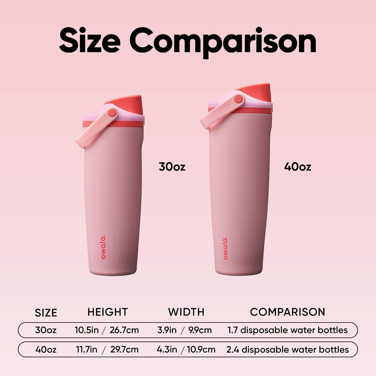 Designed for living life to the fullest, the Owala FreeSip Sway is like our original FreeSip—with even more travel-friendly features. In addition to our patented 2-in-1 FreeSip spout (you know, the one with the built-in straw and open swig option), this 40oz stainless steel water bottle holds plenty of water without being oversized. The sturdy bucket handle makes it easy to grab and go—not to mention comfy to hold. The tapered shape fits pretty much anywhere you’d stash a bottle, including most cupholders—whether it’s your car or your spin bike. The triple-layer insulation keeps drinks cold for up to 24 hours, and the sweat-proof exterior means no slippery hands or water rings.The wide-mouth opening makes cleaning easy and adding ice even easier. Plus, it’s made with BPA-free, durable materials. Sway is the ultimate hydration companion that goes with the flow of your day. It’s the ultimate gift for anyone who needs to up their hydration game. (Yourself included.).