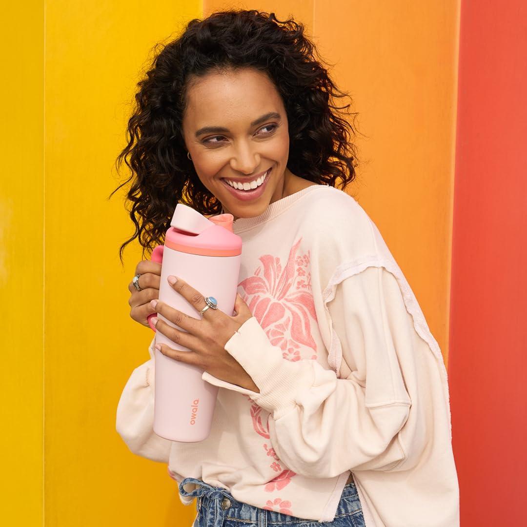 The Owala FreeSip Insulated Stainless-Steel Water Bottle with Locking Push-Button Lid easily tackles every thirst. With a built-in, easy-clean straw and a wide-mouth opening, the FreeSip reusable bottle is designed for drinking two different ways: sipping upright through the straw or tilting back to swig from the wide-mouth spout opening. Add in a push-to-open lid and playful colors, and staying hydrated has never been simpler—or more fun. Additional features include double-wall insulated stainless steel that keeps drinks cold up to 24 hours, a carry loop that doubles as a lock, a cup holder-friendly base, and a wide opening for easy cleaning and adding ice. The Owala FreeSip Insulated Stainless-Steel Water Bottle with Locking Push-Button Lid is available in three sizes: 24-Ounce, 32-Ounce, and 40-Ounce. Lid is dishwasher safe; hand wash cup. Not for use with hot liquids. Manufacturer’s limited lifetime warranty.