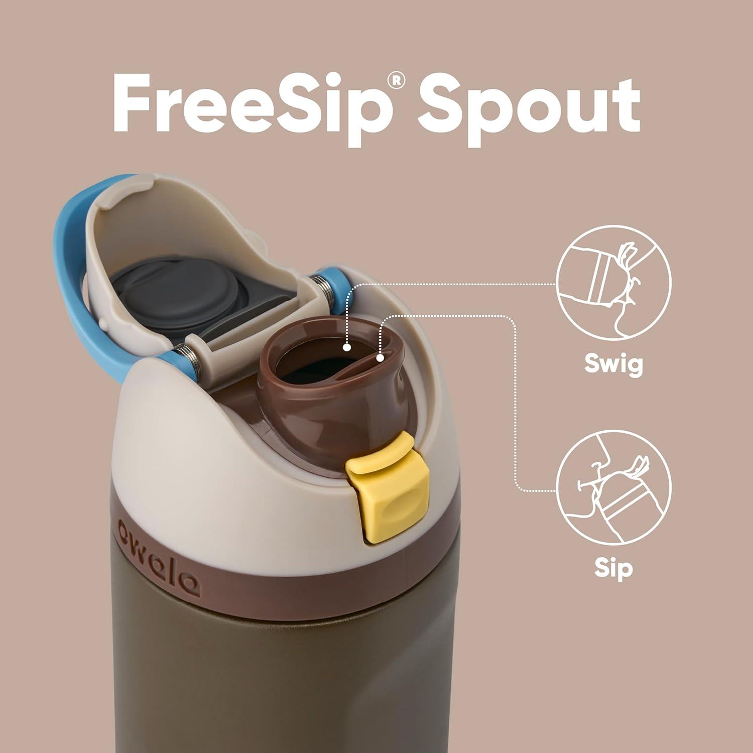 Patented FreeSip spout designed for either sipping upright through the built-in straw or tilting back to swig from the spout opening