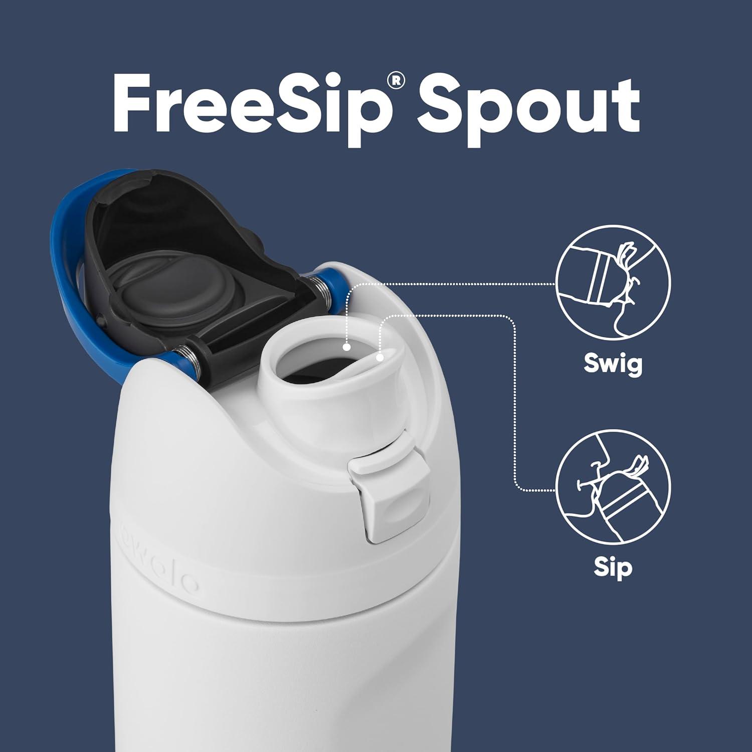 Patented FreeSip spout designed for either sipping upright through the built-in straw or tilting back to swig from the spout opening